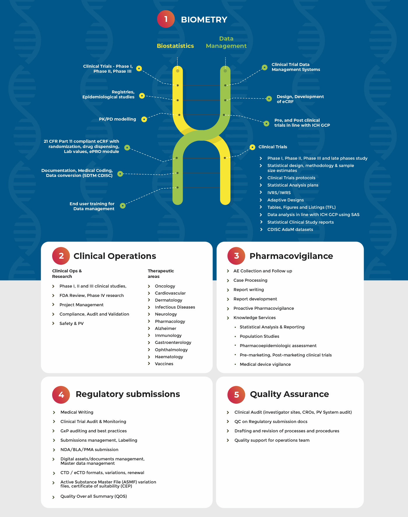 We are focused on providing Biometrics, Data Management, Drug Safety, Regulatory Affairs and Quality Assurance Expertise to Pharmaceutical, Biotechnology and Medical Devices companies worldwide.